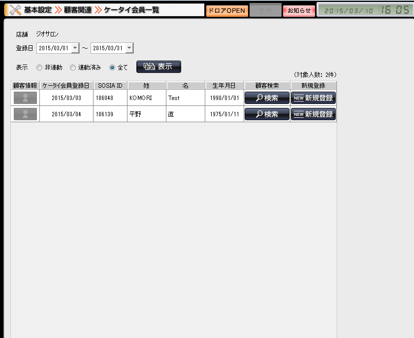 こちらの画面にて、ケータイホームページに会員登録して頂いた顧客情報と、SOSIA POSでのご登録頂いた顧客情報との紐付けをして頂くことができます ※オプションのケータイ予約をご使用の場合のみ。 ※登録方法につきましては、別紙の『ケータイ予約システム運用マニュアル』の 【SOSIA POSの顧客と連動するには?】の項目をご覧下さい。
