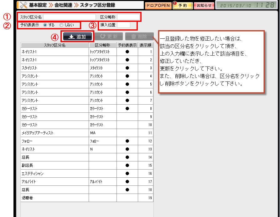 - 1上の図の様に、必要なスタッフ区分名を入力し、区分名の略称を入力して下さい。 略称を登録頂くと、スタッフ名の後ろに区分略称が表示されます。