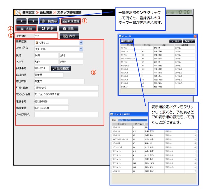 ※入力済みのものを修正・削除して頂くには、一覧表示で該当のスタッフを選択、もしくはスタッフNo欄に該当スタッフのNoを入力し、『表示』をクリックして頂くと入力済みの内容が表示されます。