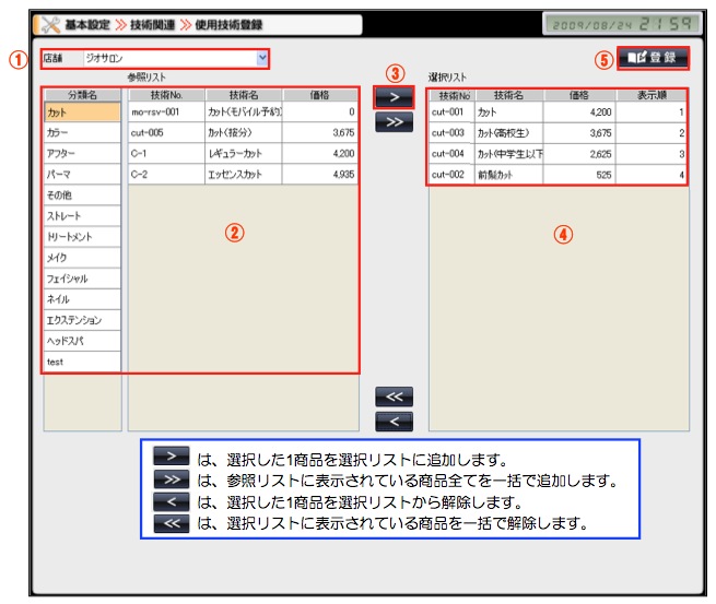 ※使用されなくなった技術ができた場合、選択リストから参照リストに移動し、登録して頂くと、お会計時のリストに表示されなくなります。