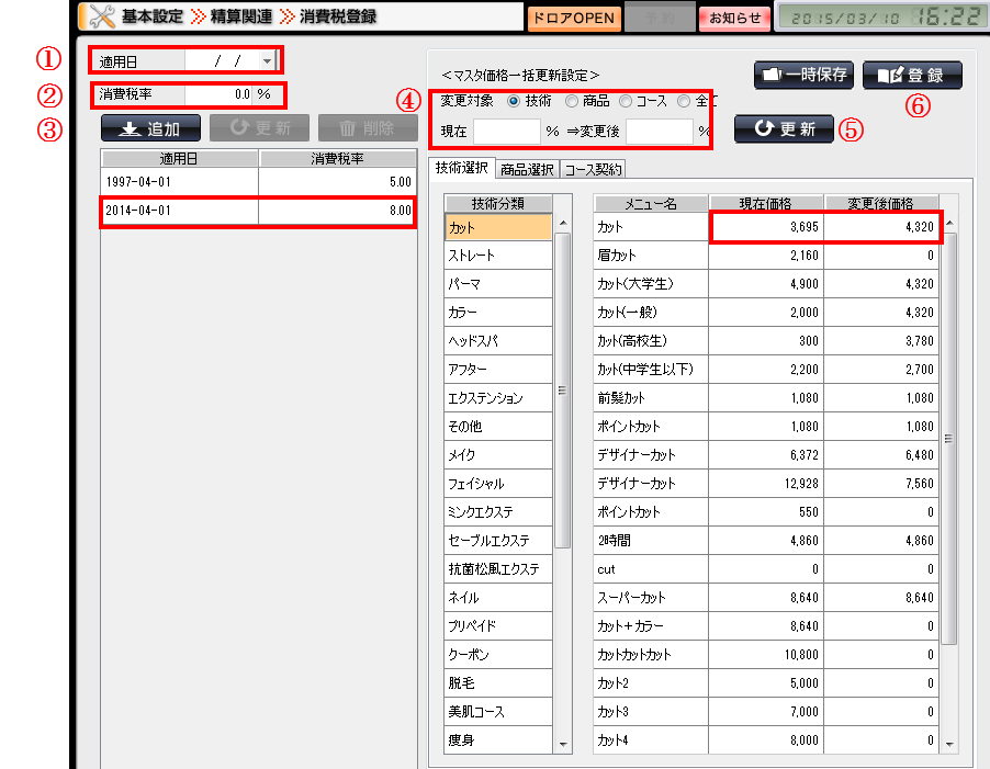 - 4変更対象を選択し、現在の税率、変更後の税率を入力してください。
