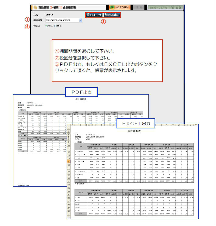 2登録した棚卸内容の店販・業務、また分類別・仕入先別の合計一覧を帳票にて確認して頂くことができます。