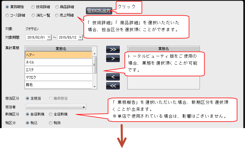 2すると、下の様な検索画面が表示されますので、確認したい報告にチェックを入れて頂き、税区分、担当者(選択されない場合は、店舗全体の報告となります。)、対象期間を選択して頂きましたら、EXCEL出力ボタンをクリックして下さい。 EXCELにて報告画面が表示されます。