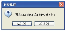 2実際の使用方法として、予約登録時に【新規登録】ボタンをクリック頂くと、下記の様な自動採番の確認メッセージが表示される為、『はい』をクリック頂くと、自動的に既に登録済みのカルテの最終番号+1の番号が「顧客No」に反映されます。