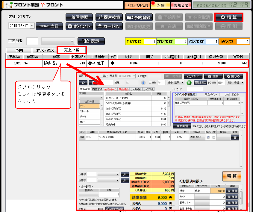 また、お客様が来店されましたら、顧客名を選択して頂き、そのままダブルクリック、もしくは在店ボタンをクリックして頂くと、在店状態にして頂くことができます。