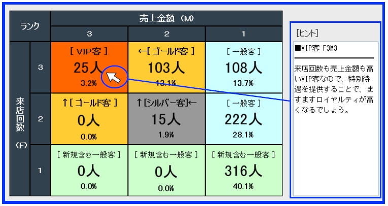 クロス分析では、来店回数と売上金額の2つの視点からそれぞれ3つのランクにわけることにより、どのランクの顧客が全体の何パーセントを占めているのかなどの分析結果をご覧頂くことができます。