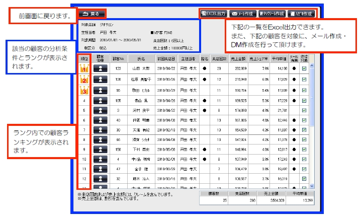 過去累積の来店回数と売上金額で分析頂くことができます。