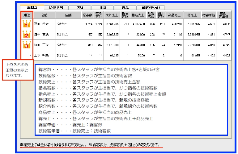 主担当でお会計された売上を基に、スタッフのランキング一覧を表示します。