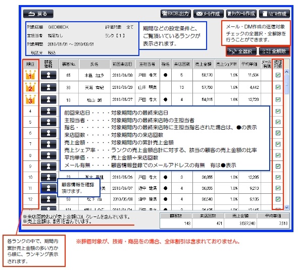 対象期間に来店されたお客様を期間中の累計売上金額が多い方から順に並べ、10等分し、10ランクに分けたものを一覧表示します。